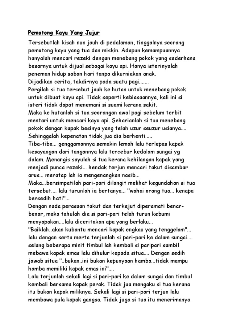 Pemotong Kayu Yang Jujur Tersebutlah kisah nun jauh di pedalaman tinggalnya seorang pemotong kayu yang tua dan miskin. Ia diadaptasi dan telah diubahsuai dari cerita sleeping beauty. Apr 15 2015 skrip cerita pertandingan bercerita bahasa melayu.